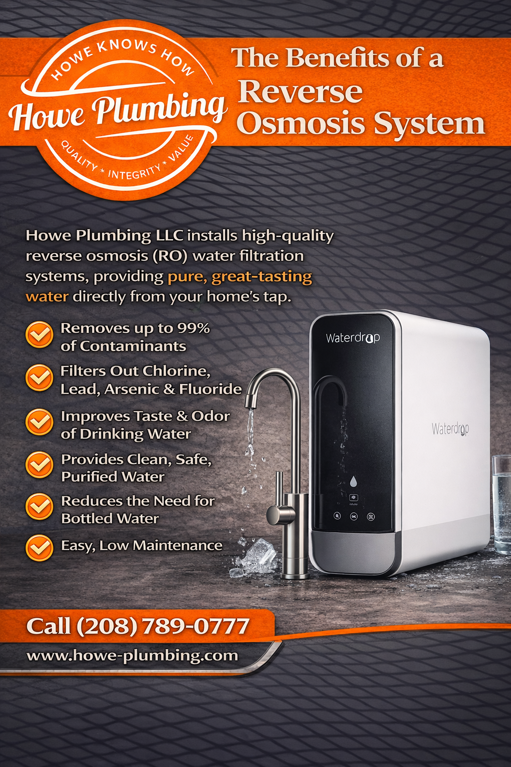 Improve your home’s drinking water quality with a professionally installed reverse osmosis (RO) system from Howe Plumbing in Boise, ID. Reverse osmosis filtration removes up to 99% of contaminants, including chlorine, lead, arsenic, fluoride, and other impurities, delivering clean, safe, and great-tasting water straight from your tap. Ideal for homeowners in Boise and the Treasure Valley, RO systems provide a reliable solution for reducing bottled water use, improving water taste and odor, and protecting your family’s health. At Howe Plumbing, we specialize in expert reverse osmosis system installation, ensuring efficient performance, long-lasting reliability, and low-maintenance operation for your home’s water filtration needs